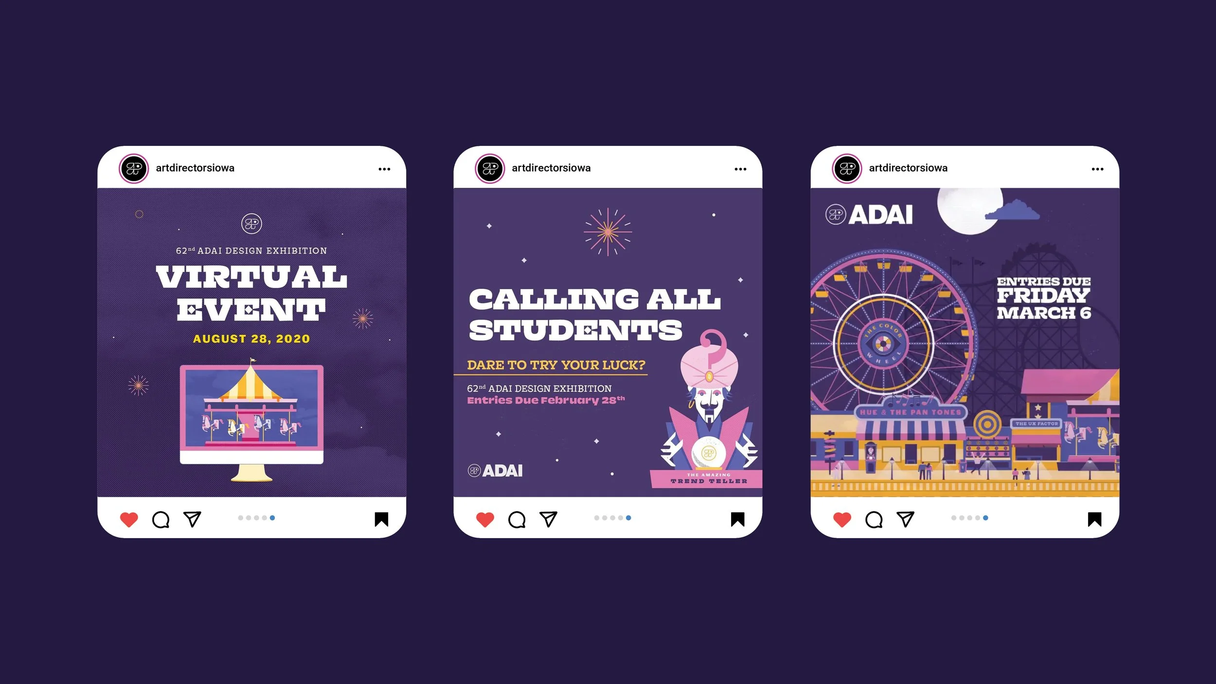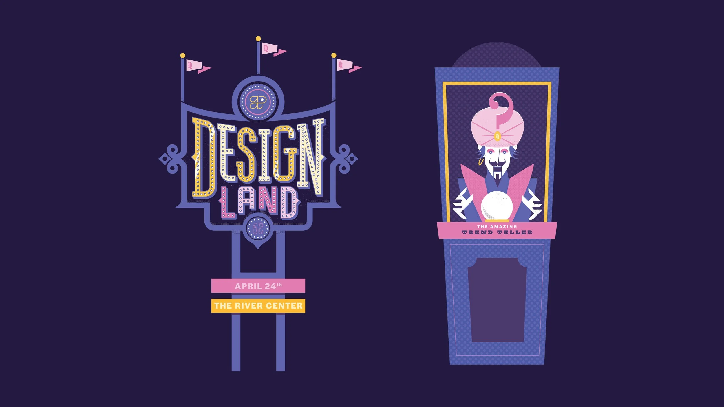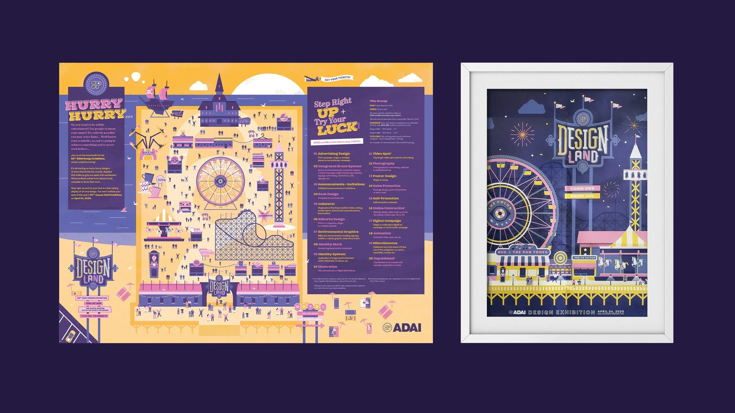 re-imagines the annual showcase as an immersive, theme park inspired celebration of creativity within Iowa’s design community. The visual identity blends bold color, playful typography, and dynamic illustration, positioning design itself as the main attraction. Centered on a call-for-entry mailer that doubles as a collectible poster, the system spans both print and digital applications. The result is a cohesive and energetic identity that reflects the spirit of the exhibition, bringing together emerging and established creatives in a shared space that celebrates innovation, community, and the evolving landscape of design.