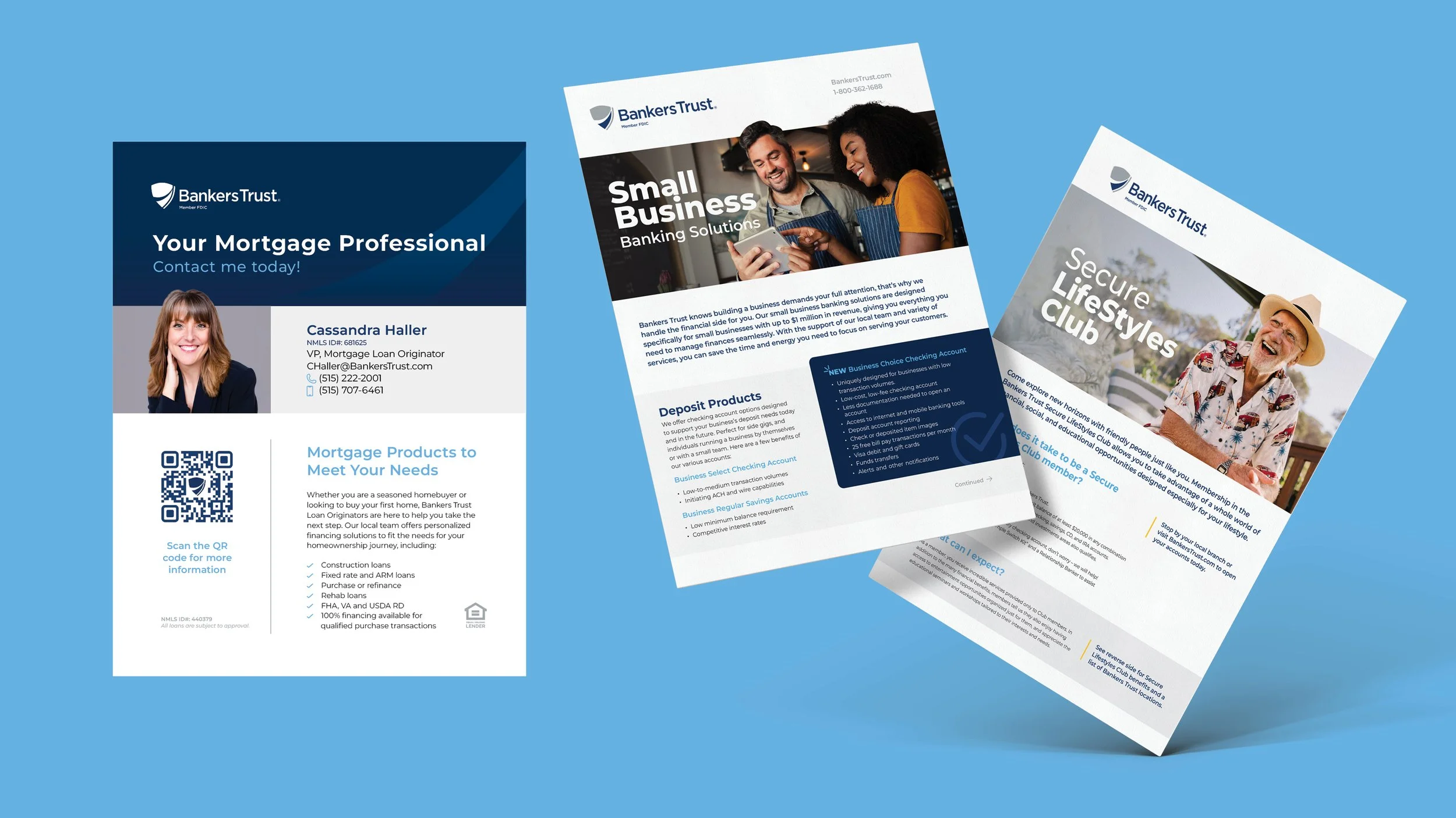 These illustrations were developed for Bankers Trust promotional materials to support and extend the brand’s visual identity with a more approachable and engaging feel; designed to complement the bank’s established style, they help communicate key messages clearly while adding personality to campaigns across print and digital touch-points.